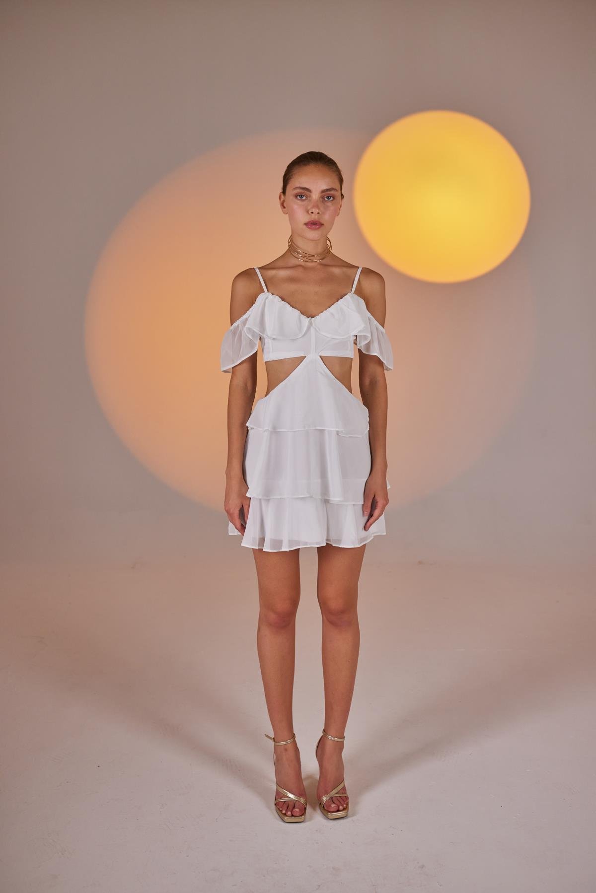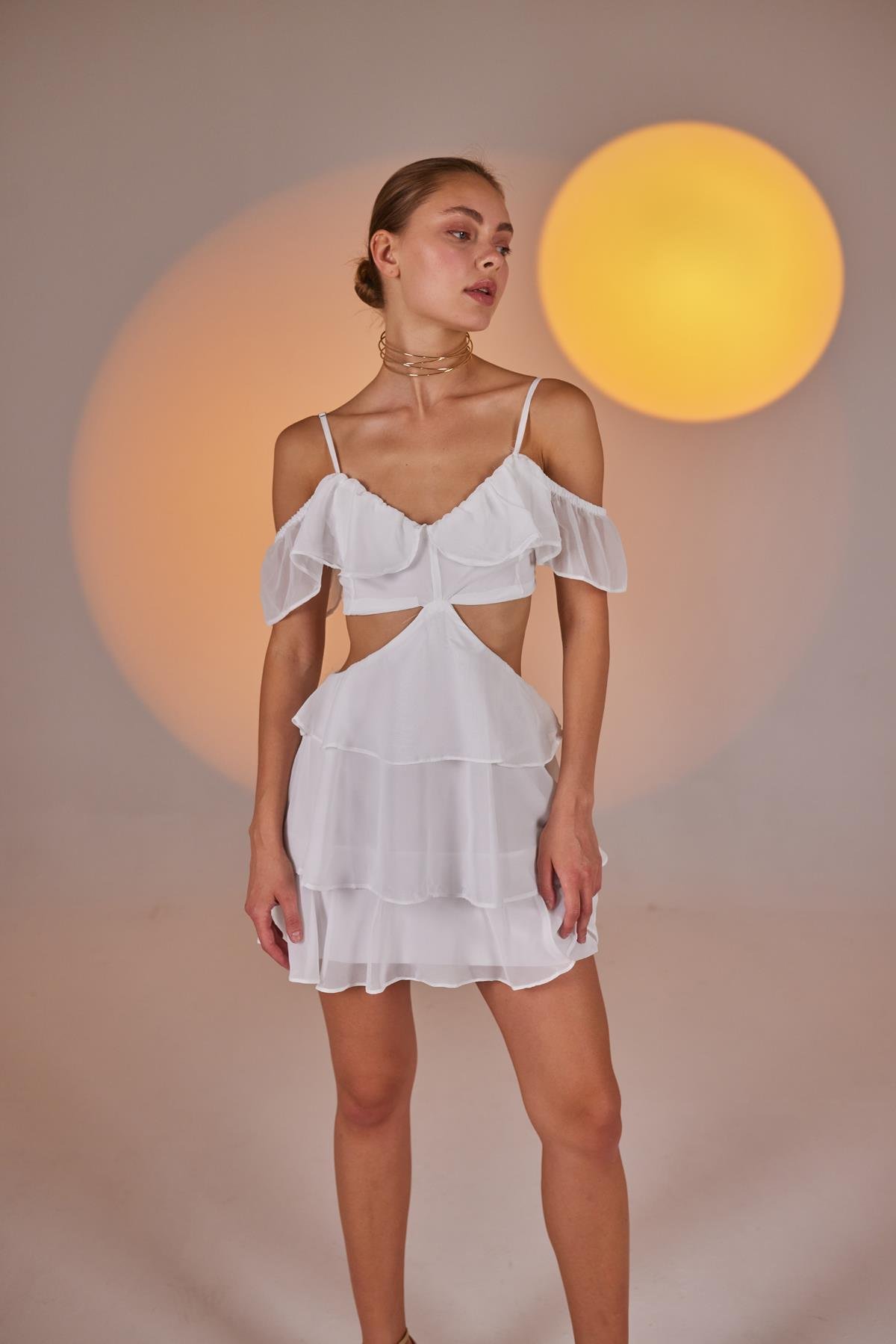 Мини-платье с открытыми плечами и глубоким вырезом.
